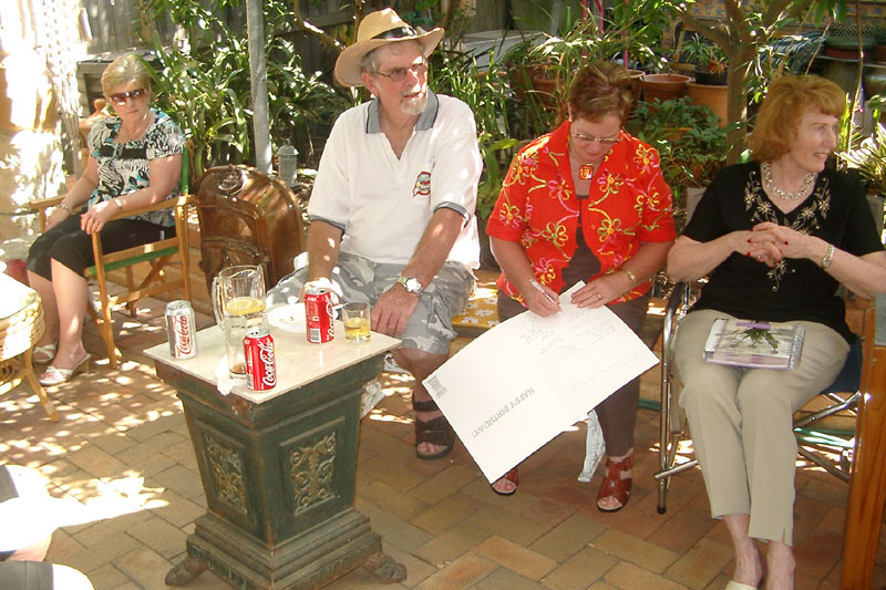 Birthday boy receiving best wishes from el President Phil, and Helen drinking to his health.